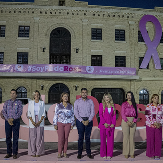 Matamoros, Tamaulipas - La noche de este martes, la fachada de la Presidencia Municipal de Matamoros se vistió de rosa en un emotivo acto de conmemoración por la lucha contra el cáncer de mama. El alcalde Alberto Granados, acompañado por la presidenta del Sistema DIF Matamoros, Anabeth Ariceaga de Granados, encabezó el evento “Iluminación #SoyPodeRosa”, cuyo objetivo es sensibilizar a la población sobre la importancia de la prevención y detección temprana de esta enfermedad.