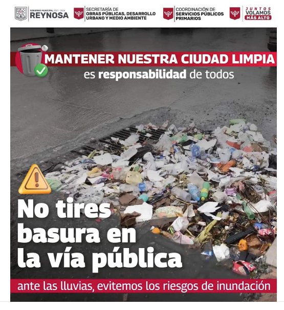 El Alcalde de Reynosa, Carlos Peña Ortiz está invitando a los ciudadanos a no tirar basura en la vía pública ya que ante el pronóstico de lluvias, se podrían ocasionar taponamientos en alcantarillas y bocas de tormenta.