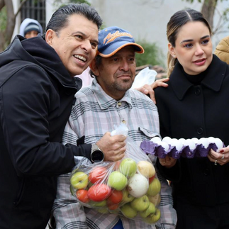 En compañía de sus equipos de trabajo, acudieron este jueves por la mañana a la colonia Villas de Guadalupe, donde entregaron 150 dotaciones más de fruta, verdura y huevo a habitantes reunidos frente al domicilio de la señora Josefina Salinas.
