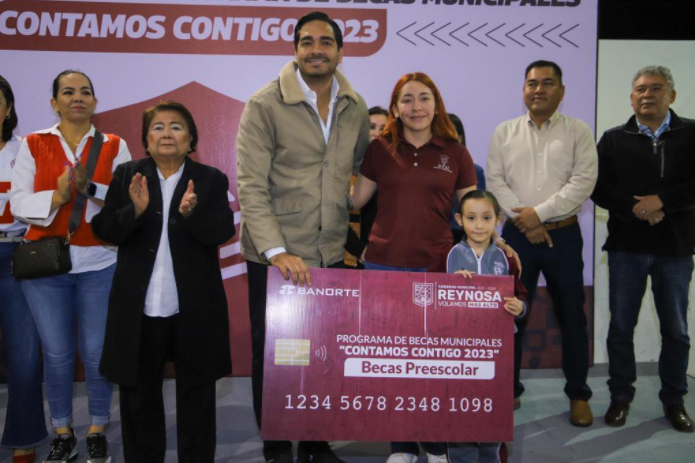 Al Presidente Municipal lo acompañaron, la Secretaria de Bienestar Social, Hidilberta Velázquez Mendoza, miembros del Cabildo, funcionarios municipales y en su presencia les fue entregada la tarjeta del Programa de Becas Más Grande en la Historia de Reynosa a la niña de Preescolar Julieta Martínez Ramos; Iris Zoé Jiménez Maldonado, de Primaria y a José Luis Rodríguez Martínez, de Secundaria.