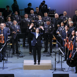 En la segunda parte del concierto se realizó una fusión única con la Orquesta Sinfónica de la Universidad Autónoma de Tamaulipas y la Banda de Guerra Monumental de la Coordinación Territorial Región Golfo de la GN.