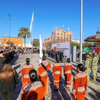 El Presidente Municipal de Reynosa, Carlos Peña Ortiz, encabezó la ceremonia conmemorativa del Día de la Bandera, acompañado por el Capitán Primero de Caballería, Juan Manuel Zetina Santiago, representante del General de Brigada DEM, Fernando Colchado Gómez, Comandante de la Octava Zona Militar.