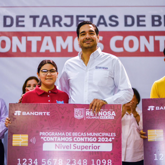"Ustedes han tenido la fortuna de seguir estudiando en la Universidad y son ejemplo para muchos jóvenes reynosenses de las siguientes generaciones; invitamos a quienes van a terminar a que estén pendientes de las Becas de Titulación para que se beneficien también de este apoyo", dijo el Presidente en la primera entrega de tarjetas para universitarios.
